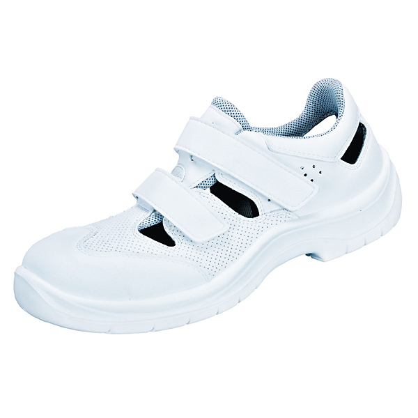 Eine weiße, komfortable Sandale. Schaft aus Texfiber, maschinenwaschbar bis 30°, anatomisch geformte Decksohle, Futter aus antibakteriellen Gewebe, HACCP geeignet, Kunststoffkappe, antistatische, öl- und säurebeständige, rutschhemmende 1-Schichten-PUR-Sohle, Weite 11, ergonomisch geformter und gepolsterter Schaftrand, Verschluss durch 2 Klettriemen, angenähte und gepolsterte Staublasche.